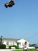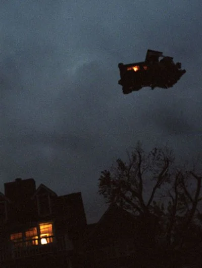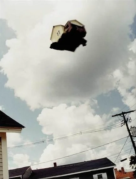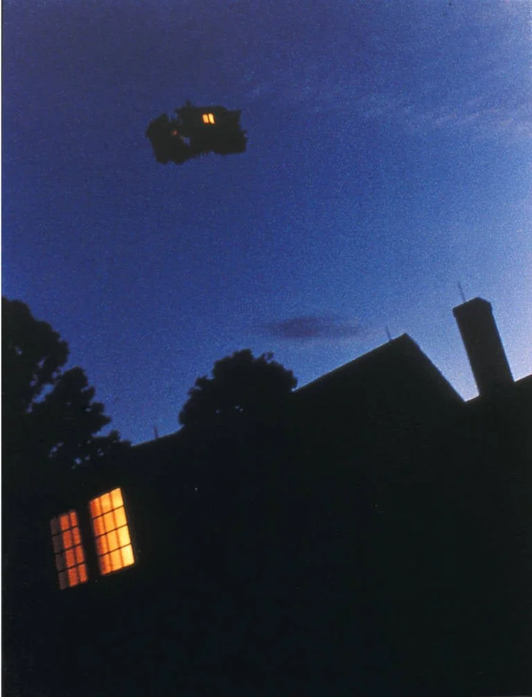 When I first saw Peter Garfield’s “Mobile Home” photographs two years ago, I was immediately drawn in by his lightness of touch. Presented with a disarming nonchalance, these images of suburban houses flying through the sky possessed a humorous innocence — whimsy, even — that directed my attention. And yet there was something too normal about these photographs of very extraordinary occurrences. A disturbing mundaneness colored the otherwise cheerful buoyancy of these fantastic images. Was I witness to a disaster or a dream? The incongruity of the airborne domiciles with sunny blue skies and innocuous cottony clouds seemed to rule out an act of nature. Perhaps it was some man-made catastrophe of a scale only made possible by late twentieth-century technology. In the absence of any definitive answers, I was left with an alternately thrilling and discomfiting sensation — thrilled at seeing a remarkable event, discomfited that I could not interpret exactly what I saw.